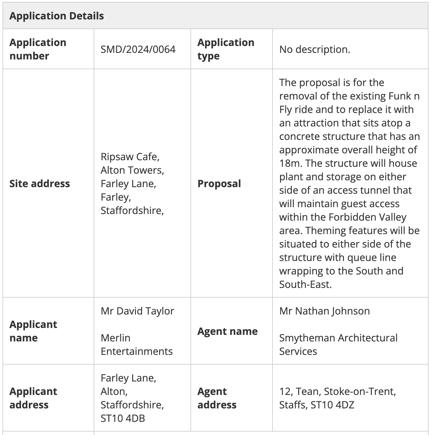 While the park hasn’t confirmed anything, a planning application submitted to the Staffordshire Moorlands District Council website on 6th February 2024 confirms that something is indeed coming. The application doesn’t specifically say what it is, only that it will be located on the site of Funk N Fly and have an overall height of 18m. Ordinarily, this might not be much information to go on, but what other ride just so happened to also have a height of 18m? Yep, you guessed it – Ripsaw.