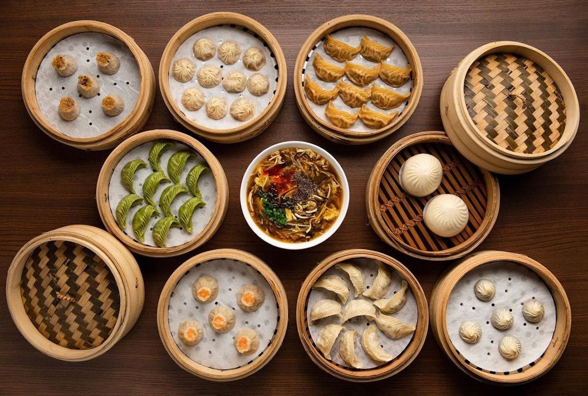 Din Tai Fung interior (left) and a selection of dumpling dishes served at the restaurant. Disney/Din Tai Fung.