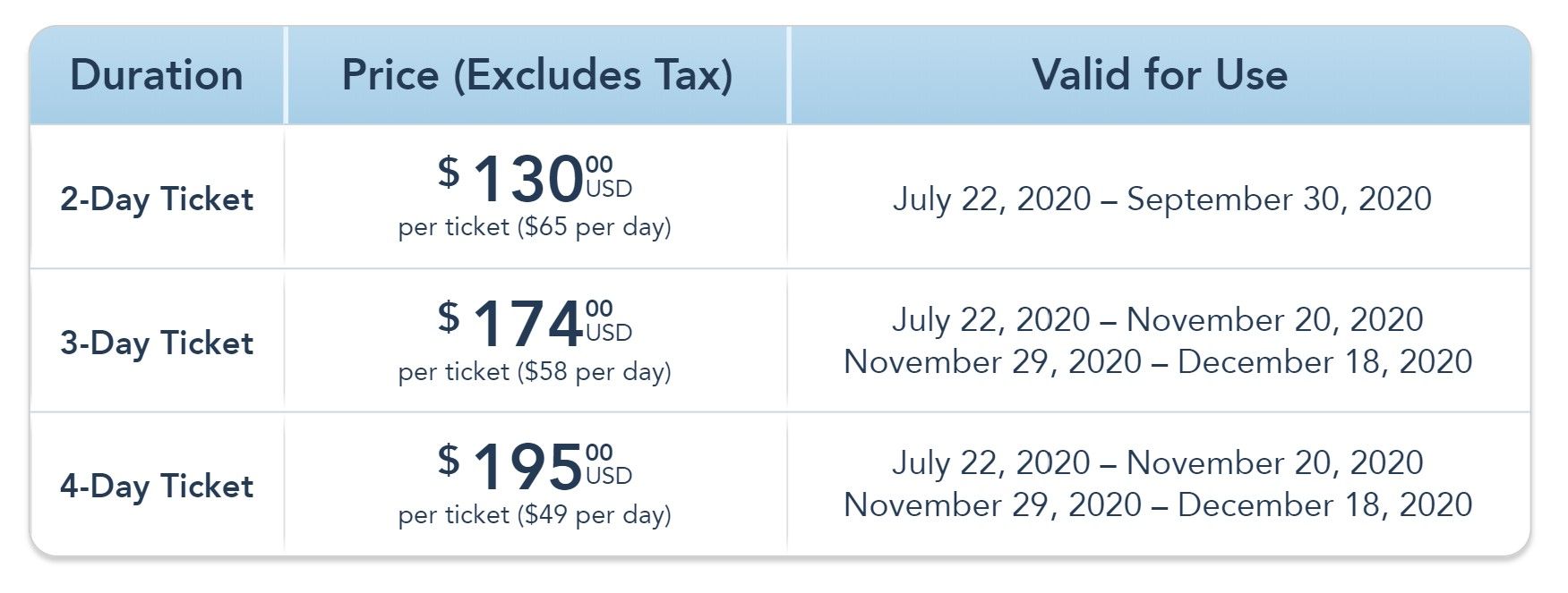 Get a 2-day Florida Resident Disney Magic Flex Ticket for just $130 plus tax (that’s just $65 per day plus tax). Or, enjoy more magic with a 3-day or 4-day specially priced ticket. With the Florida Resident Disney Magic Flex Ticket, you can enjoy 2, 3 or 4 days—depending on the ticket purchased—at one Walt Disney World theme park per day. These flexible tickets can be used at any one of our 4 theme parks on non-consecutive days throughout the offer period (subject to availability).