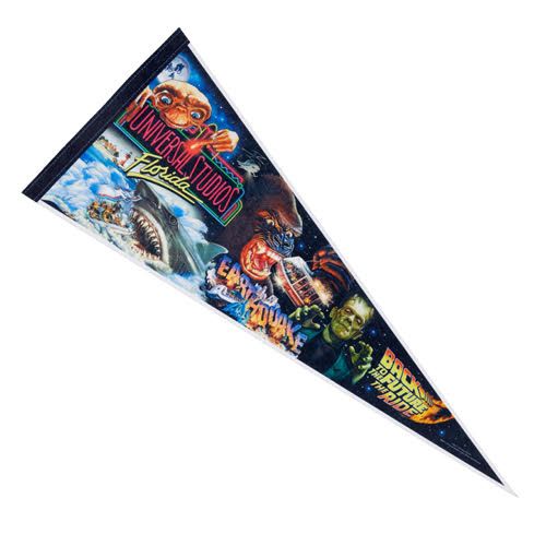 Some folks like baseball, others dig football… I’m a theme park fan all the way and this pennant says it all. Design features retro illustrations that pay homage to some of the iconic classics that started it all – E.T., Back To The Future, King Kong, Jaws, Earthquake, and Frankenstein.