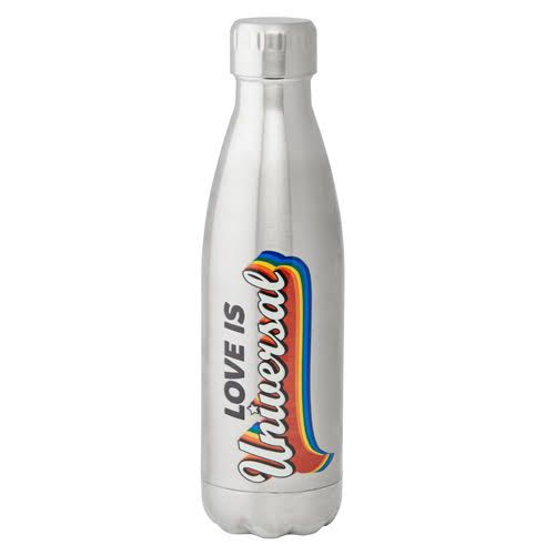 Our “Love is Universal” message is proudly displayed on this take-anywhere-style, stainless steel travel bottle. The design features retro white & black lettering with rainbow stripes repeated on both sides.