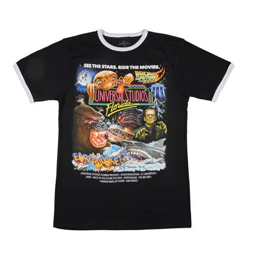 Commemorate the classics with this Universal Studios Florida adult ringer t-shirt. Design features retro illustrations that pay homage to some of the iconic classics that started it all – E.T., Back To The Future, King Kong, Jaws, Earthquake, and Frankenstein. The graphic is screen printed on a comfortable, solid-black garment with white trim accents around the neckline and sleeves.