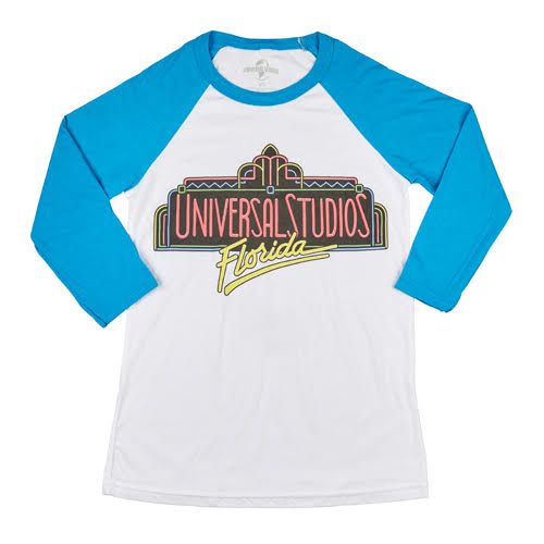 We love this vibrant ladies' raglan t-shirt featuring our retro “Universal Studios Florida” marquee logo! The design is screen printed on a lightweight, fitted white shirt body with turquoise raglan sleeves and neckline.