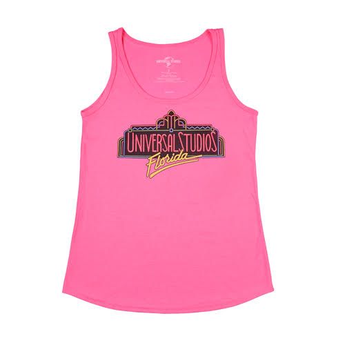 Flashback with this lively ladies' racerback tank top featuring our retro “Universal Studios Florida” marquee logo. The design is screen printed on a lightweight, neon pink shirt body with a rounded hem.