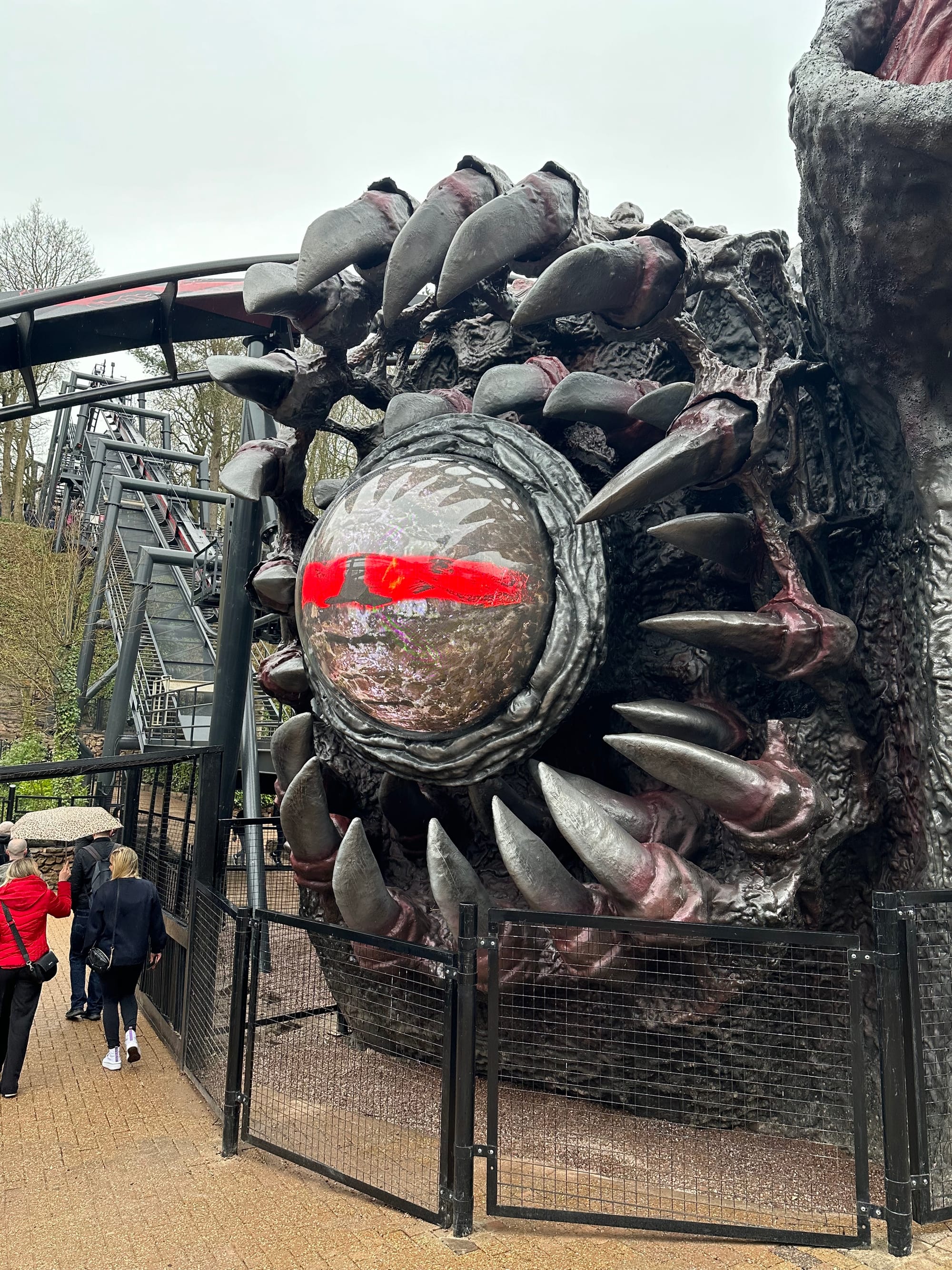 Now, the monster itself has its head turned slightly to the left. Gone are the eyes on stalks (one of which looks to have appeared in Forbidden Valley’s new merch store) which have been replaced by a massive, round, teeth-lined mouth, with an enormous eye in the centre. The eye is in fact a screen, with a moving, blinking eyeball that watches the train as it passes. It even becomes enraged as the train twists over the zero-g roll, and many of the teeth open and close. This brings a huge amount of new energy to the area and acts a centrepiece for this completely revitalised ride.